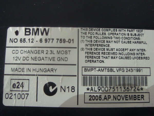 Leitor CD Changer BMW 1 (E87) | 03 - 13 65.12-6 977 759-1 | BMPT-AMTSBL VFG 243/1991 Referência TELEPEÇAS: 825342 04 Set 2024 |
