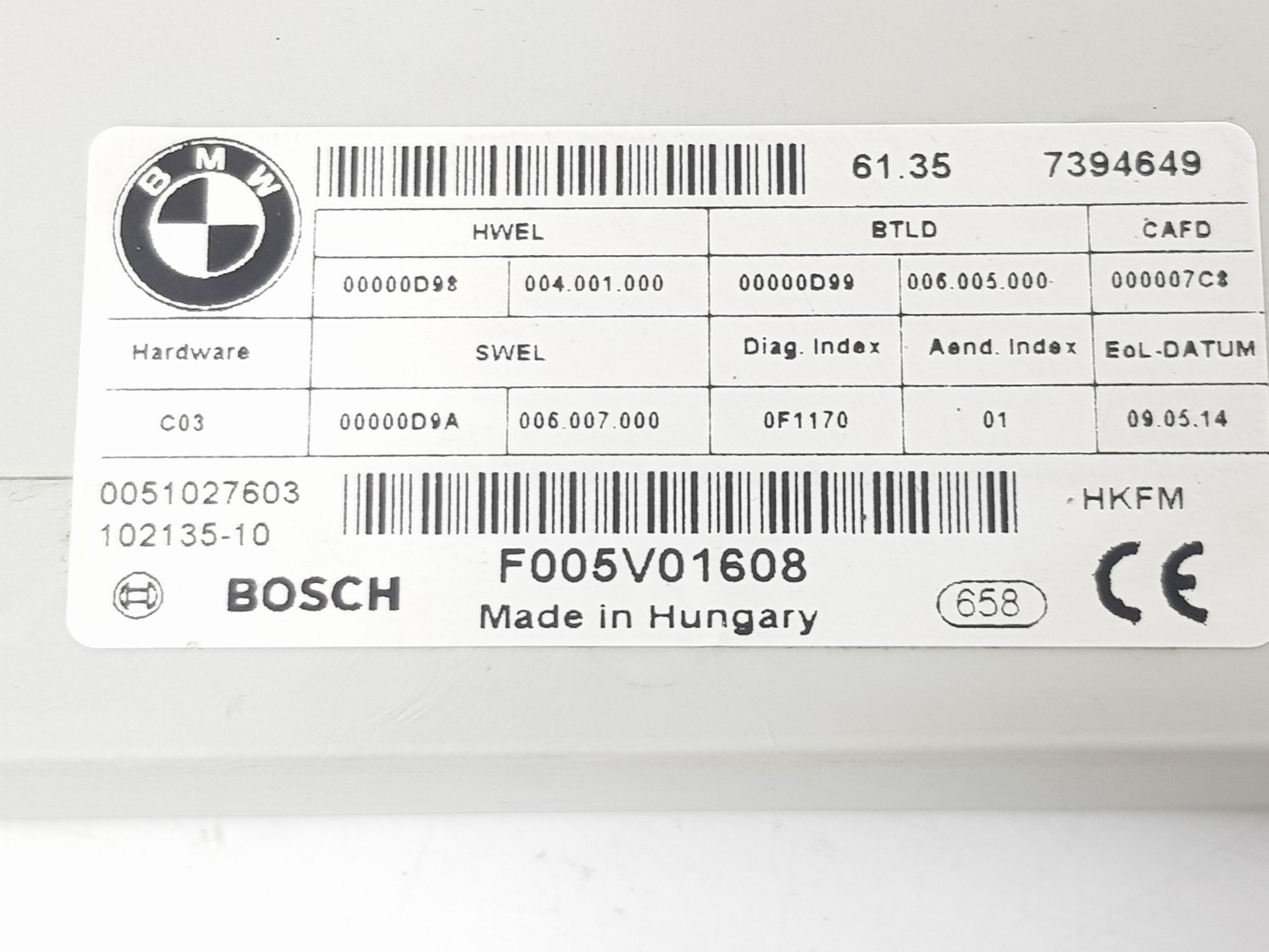 | Observações | 61357394649 Unidad de control para módulo de función trasero BOSCH: F005V01608 |