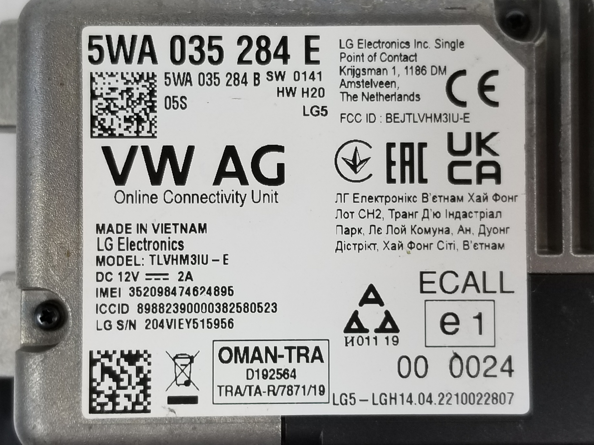 | Observações | Unidad de control para servicios en linea 5WA035284E |